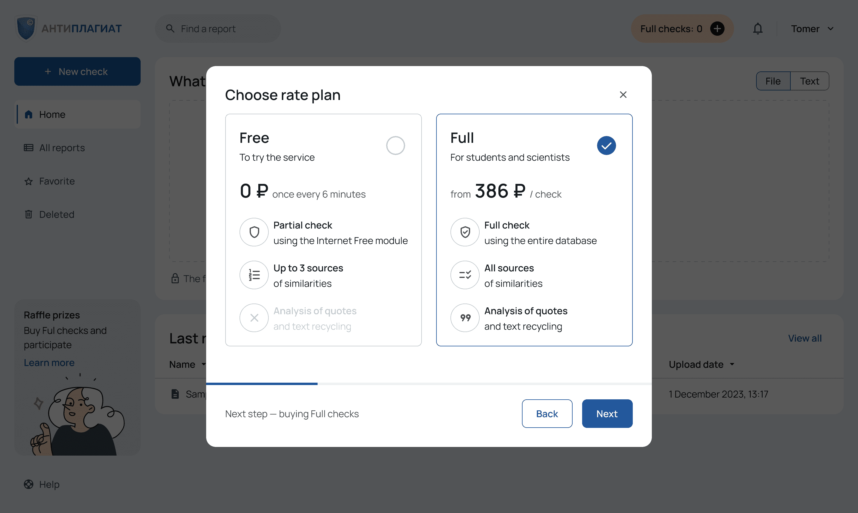 If the user logs in or signs up, the step of choosing a rate plan is skipped and the user checks a file/text on the Free rate plan by default.
