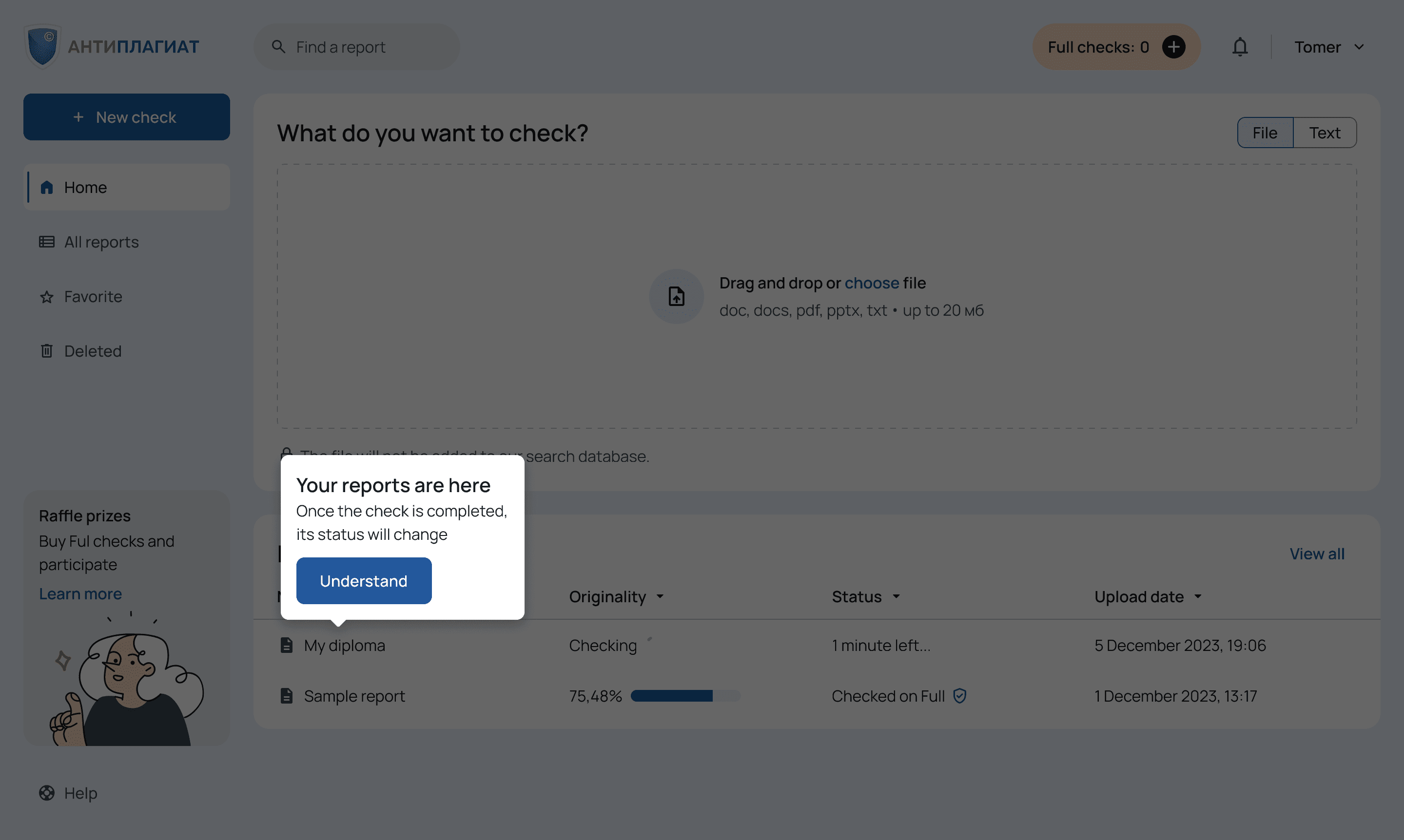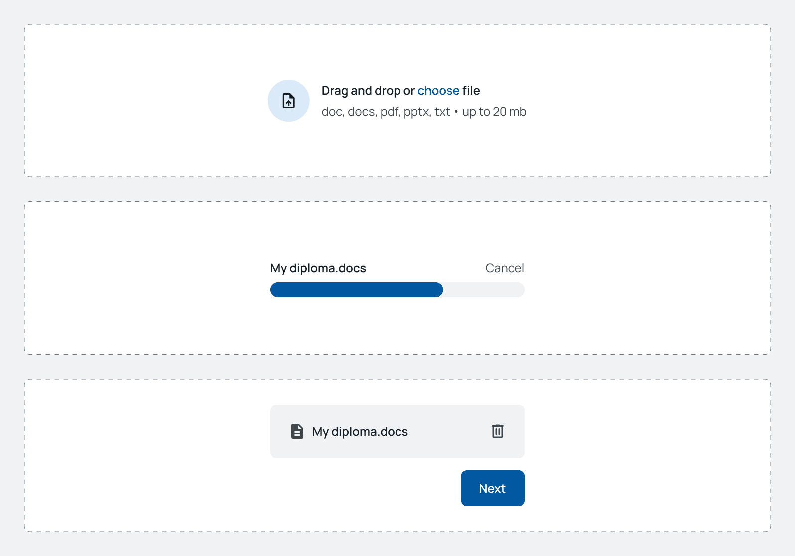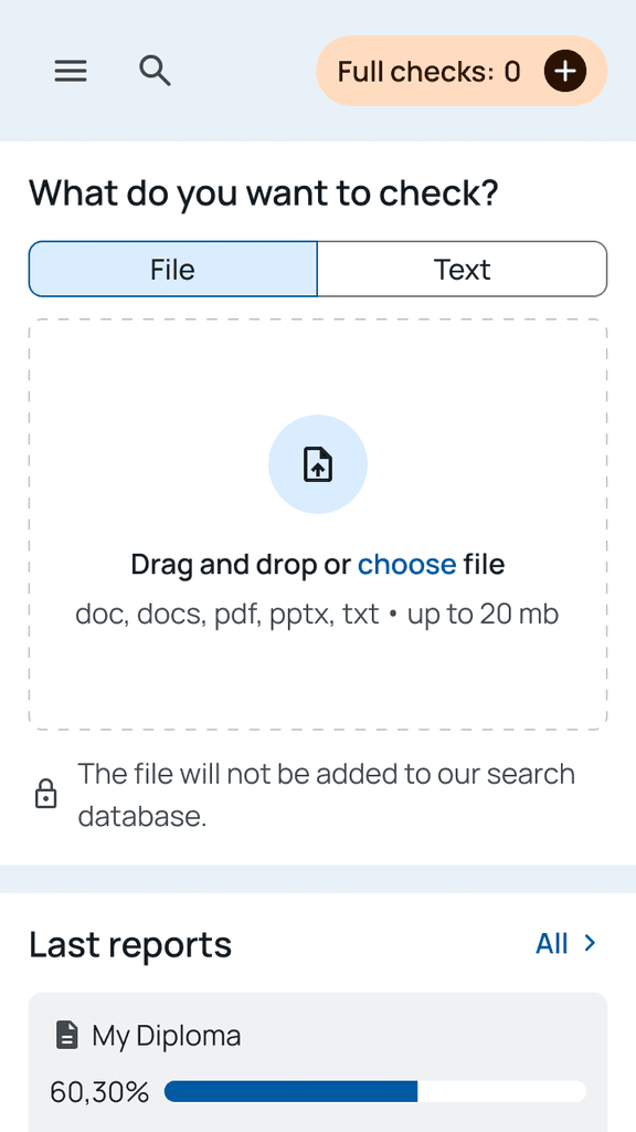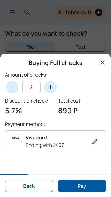 After uploading a file, the modal wizard opens. It consists of all the important steps to get a file or text checked and prevents the user from wandering off.