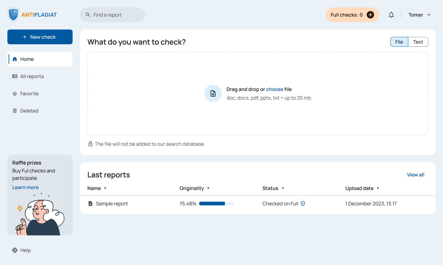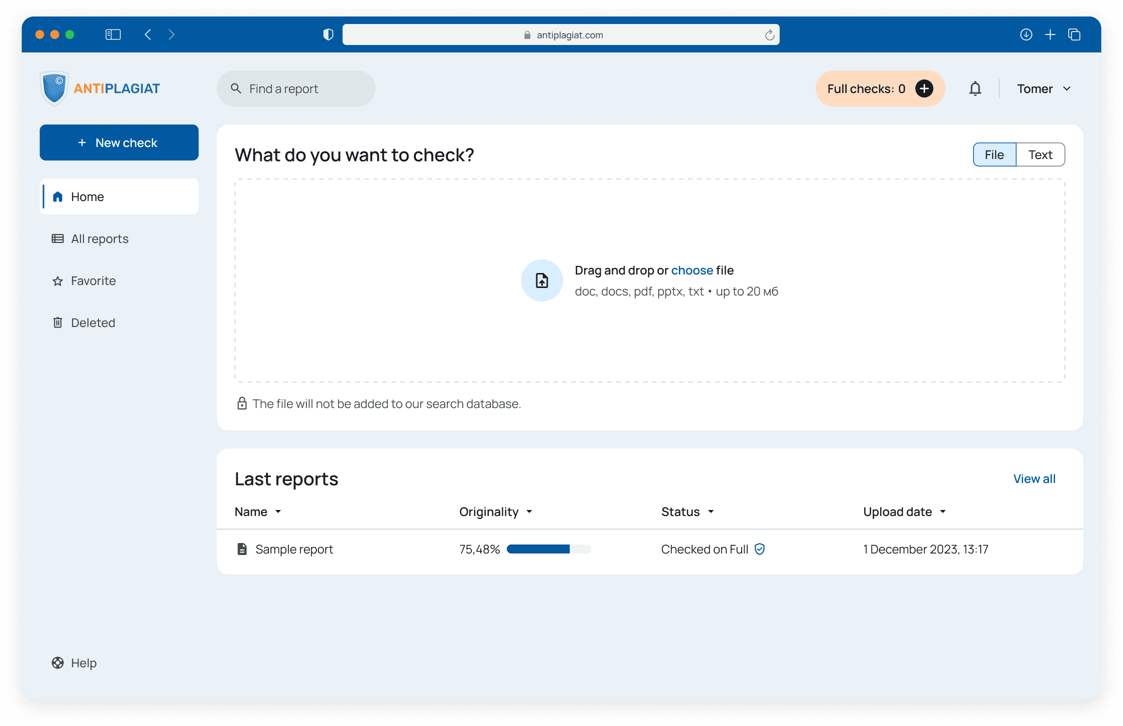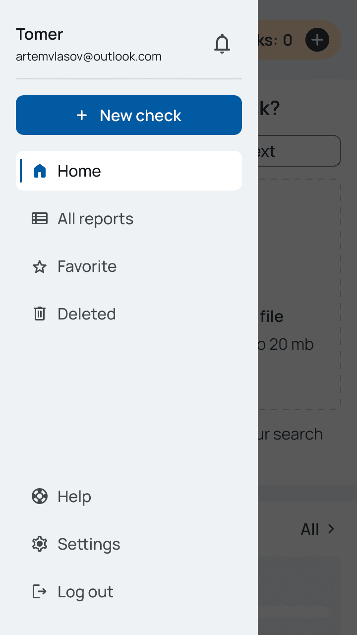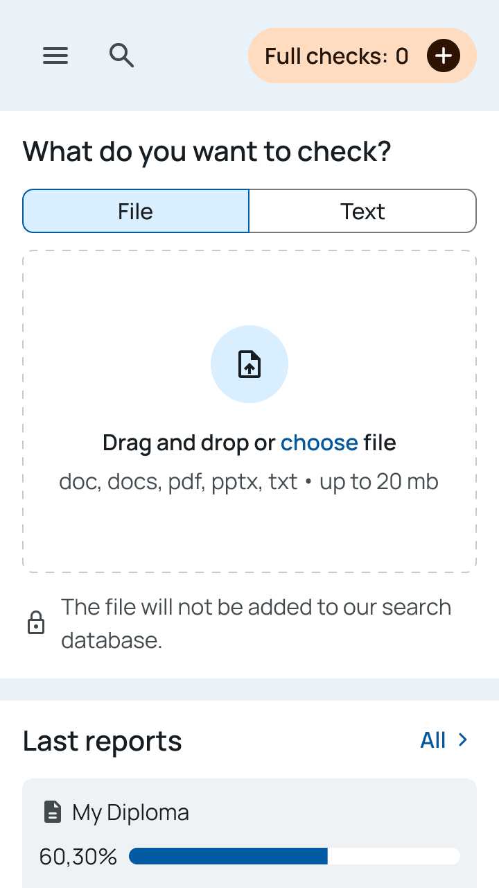 New check. There was no new check feature on the Full report page. On the Free report page, this feature should allow users to check any file, not an open one.